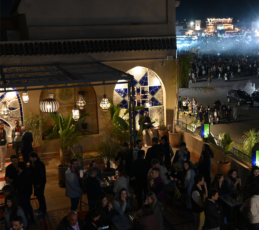 Depuis la terrasse, modernité et tradition se mélangent pour vous laisser emportés par les chants, danses de la foule de la place Jamaa El Fna, et de la magnifique vue sur le minaret de la Koutoubia et des montagnes de l’Atlas. .